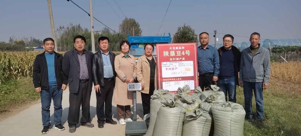 專(zhuān)家組嚴格按照《全國油料高產(chǎn)創(chuàng )建測產(chǎn)驗收辦法(試行)》中的“大豆測產(chǎn)辦法”,隨機選點(diǎn)進(jìn)行實(shí)測,扣除雜質(zhì),折合標準水分,“陜墾豆4號”最終實(shí)收畝產(chǎn)達到343.49公斤,刷新陜西省夏播大豆單產(chǎn)新紀錄。